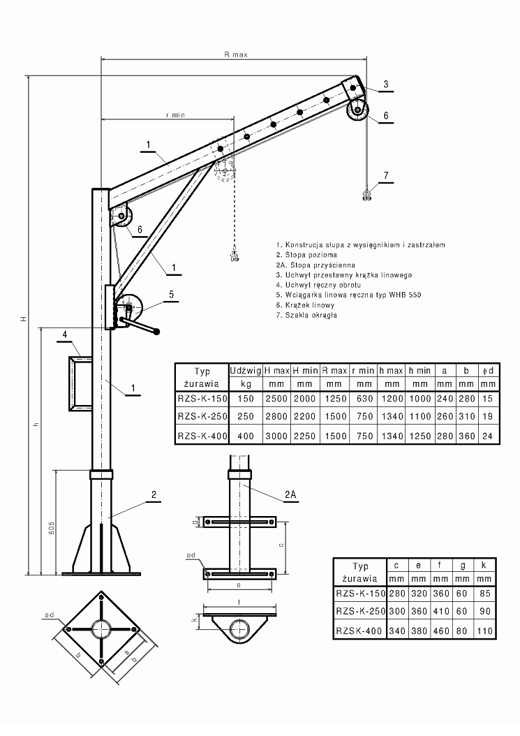 wykonanie standardowe w ocynku. Żuraw wyposażony jest w ręczną wciągarkę linową - nie wymaga to rejestracji w UDT.
