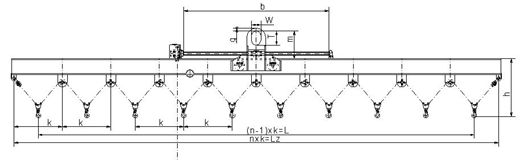 TRAWERSA UNIWERSALNA PRZEZNACZONA JEST DO TRANSPORTU ELEMENTÓW O ZMIENNYM POŁOŻENIU ŚRODKA CIĘŻKOŚCI I WIELU PUNKTACH ZACZEPOWYCH ZNAJDUJĄCYCH SIĘ NA RÓŻNEJ WYSOKOŚCI. ILOŚĆ HAKÓW ZACZEPOWYCH W ZALEŻNOŚCI OD POTRZEB. UCHO TRAWERSY MOŻNA USTAWIĆ ZA POMOCĄ NAPĘDU ŚRUBOWEGO CO POWODUJE SZYBKIE WYREGULOWANIE JEGO POŁOŻENIA DO ŚRODKA CIĘŻKOŚCI PODNOSZONEGO ŁADUNKU. UCHO TRAWERSY PROWADZONE JEST ZA POMOCĄ ROLEK TOCZNYCH.