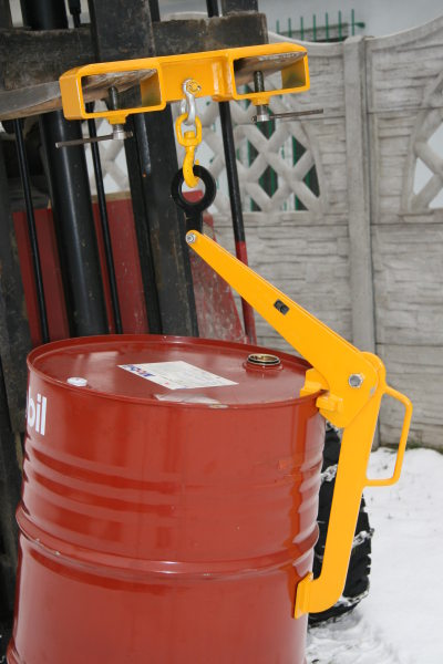 Zdjęcie przedstawia uchwyt do transportu beczek Typ BP oraz sposób jego mocowania na beczkach. Uchwyt zamocowany na uchwycie widłowym Typ UW-1.