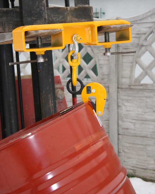 Na zdjęciu uchwyt Typ BPR DOR 500kg do pionowego podnoszenia i transportu beczek metalowych. Uchwyt zamocowano na uchwycie widlowym wózka widlowego Typ UW-1.