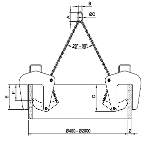 | Typ | Zakres chwytania | DOR kg | A | B | C | D | E | F | Waga kpl |