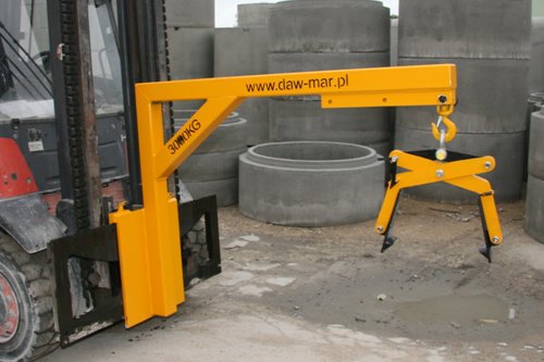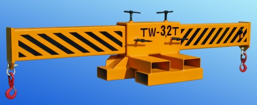 Trawersa przestawna zamontowana na karetce wózka widłowego DOR 3t i długości 1,0 do 1,5m. Trawersa dodatkowo wyposażona w uchwyt do podnoszenia i transportu ścianek oporowych przepustu rurowego Typ UsD-PR