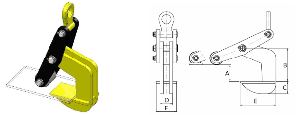 Uchwyty do podnoszenia i transportu blach w poziomie Typ 2 UBP/R DOR 3200kg i zakresie chwytania 10-100mm wyposażone w rolkę. Możliwość wyposażenia w stopkę dociskową.